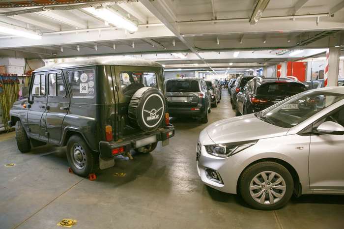 На регистрацию и погрузку лучше приезжать за полтора часа — совершенно спокойно успеете получить карточки на ресторан и Wi-Fi,ключ карту от номера и талончик на машину — сама погрузка занимает около 40 мин(на паромах порядка 120 мест для машин).