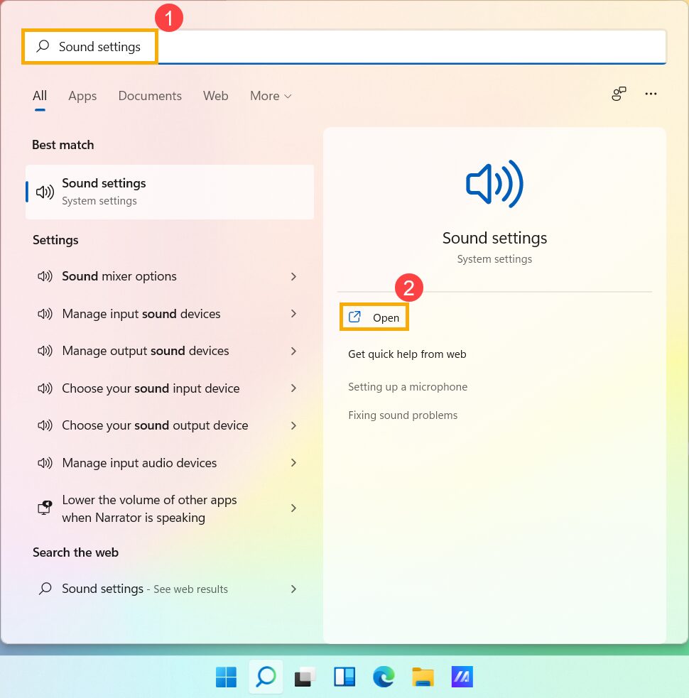 - Введите и найдите [Настройки звука] в строке поиска Windows ①, а затем нажмите [Открыть] ②.