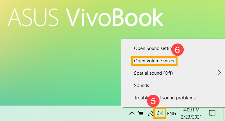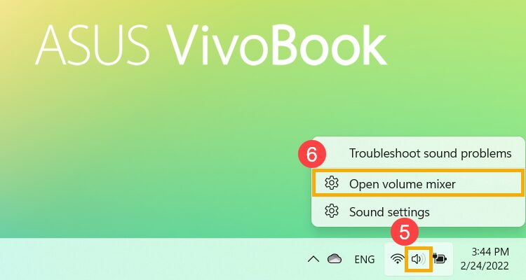 - Начало использования микшера громкости. Щелкните правой кнопкой мыши [значок динамиков] на панели задач ⑤, а затем выберите [Открыть микшер громкости] ⑥.