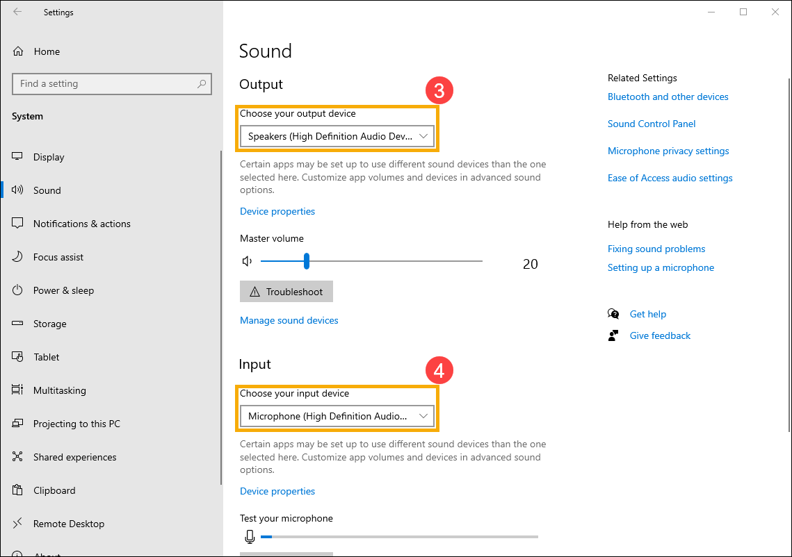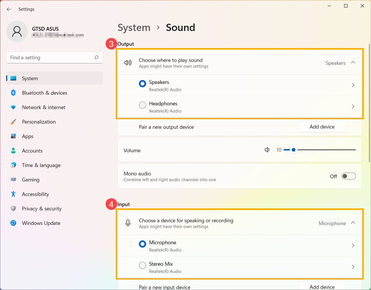 - В настройках звука Вы можете выбрать выходное устройство ③ (например, внутренние динамики, внешние динамики или гарнитура) и входное устройство ④ (например, внутренний микрофон, внешний микрофон или наушники).