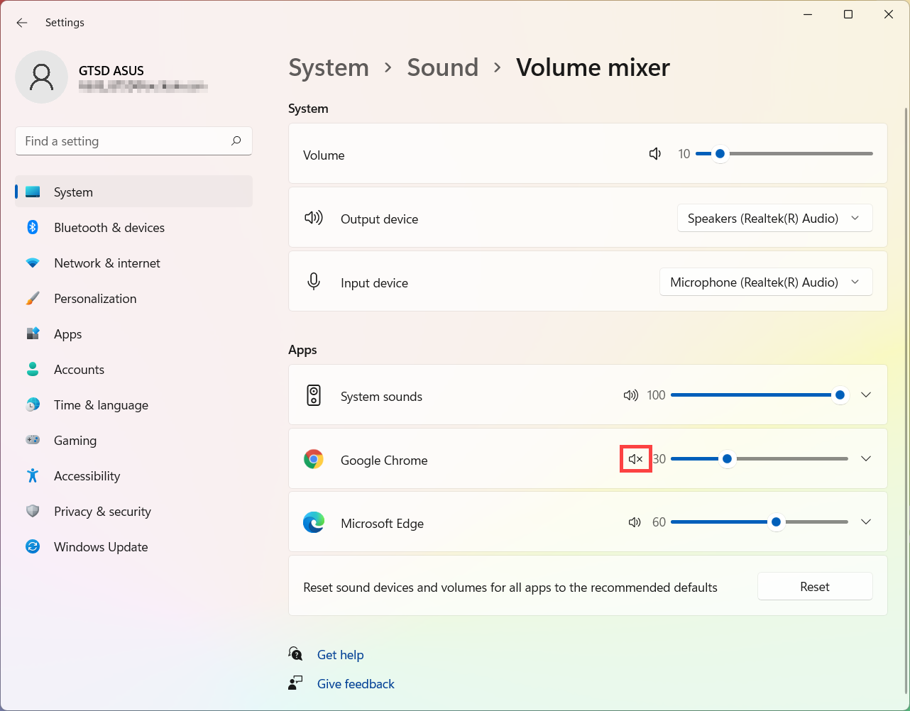 - В поле «Приложения» перетащите переключатель, чтобы отрегулировать громкость для каждого приложения ⑦.